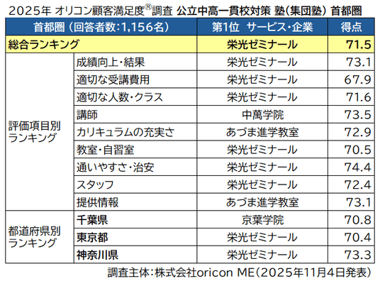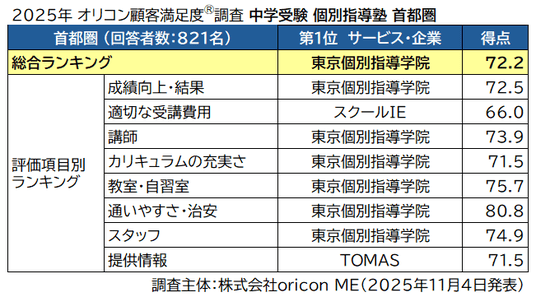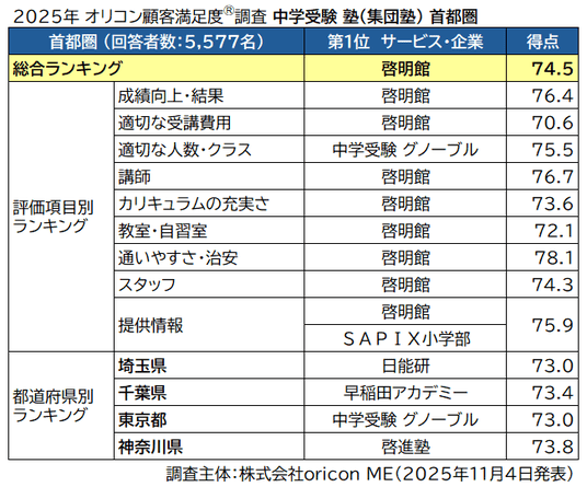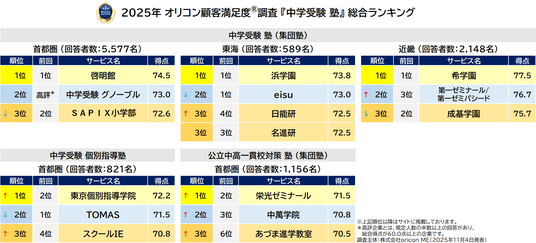 オリコン株式会社(本社:東京都港区 代表取締役社長:小池 恒、略称:オリコン)は、グループ会社である株式会社oricon MEが、実際のサービス利用者を対象に第三者の立場で実施した中学受験を目的とした塾についての満足度調査を実施し、2025年11月4日(火)14時にその結果を「オリコン顧客満足度(R)」公式サイト内( https://life.oricon.co.jp/ )にて発表いたしました。ランキングの結果は以下の通りとなりました。