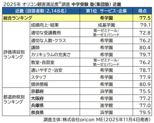 『近畿』ランキングでは、【希学園】が4年連続、6度目※の満足度総合1位となりました。総合得点では77.5点を獲得しました。(※2014-2015年、2015年、2022~2025年)