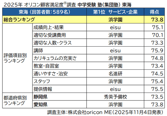 『東海』ランキングでは、【浜学園】が2年連続の満足度総合1位となりました。総合得点では73.8点を獲得しました。