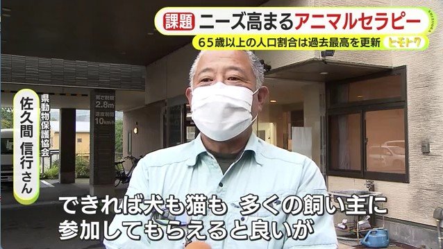この日、施設で動物たちと触れあった高齢者からは「元気なってまた犬を飼いたい」「パワーをたくさんもらって元気になりたいと思った」といった感想が聞かれ、県動物保護協会の佐久間信行さんは「動かない手が動いた、普段見られない笑顔が見られたという声をたくさんもらう」と話す。