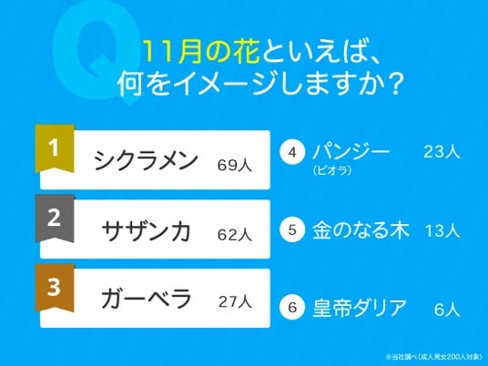 成人男女200人に、11月の花といえば何をイメージするか尋ねたところ、1位の「シクラメン」と2位の「サザンカ」が多くの票を集める結果となりました。