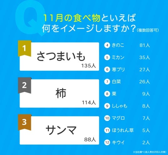 成人男女200人に、11月の食べ物といえば何をイメージするか尋ねたところ、1位は「さつまいも」でした。