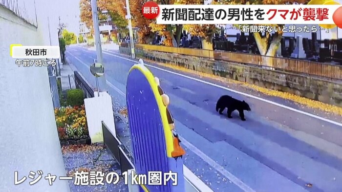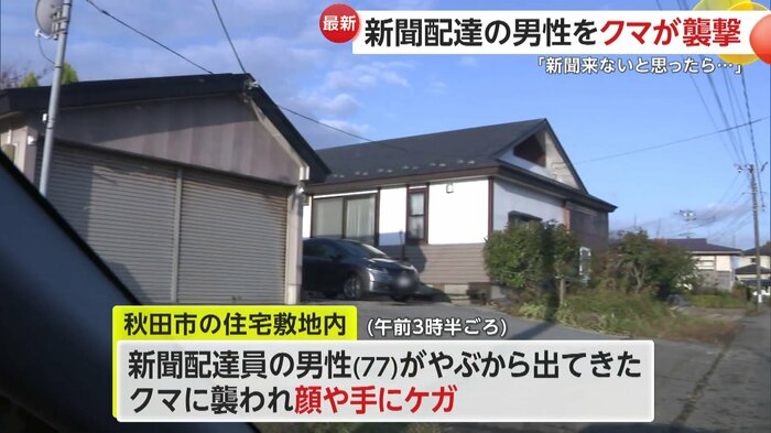 午前3時半頃、秋田市の住宅の敷地内で新聞配達をしていた77歳の男性が、やぶから出てきたクマに襲われ、顔や手にケガをした。