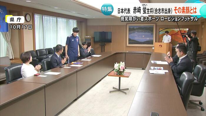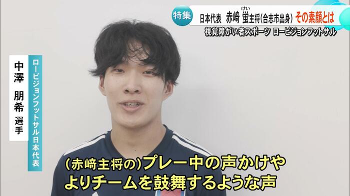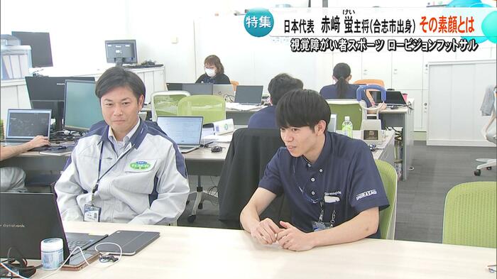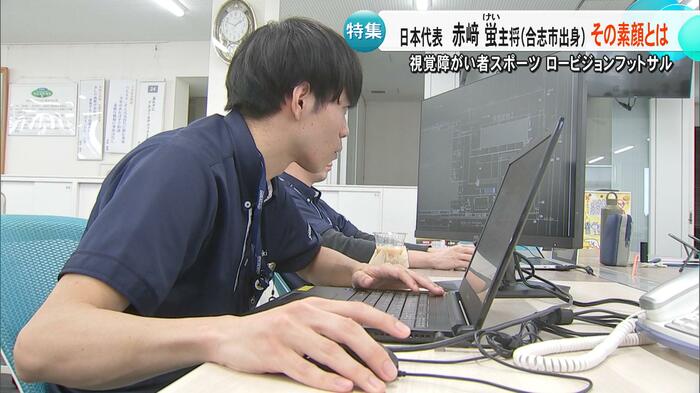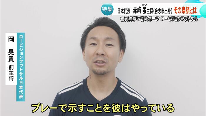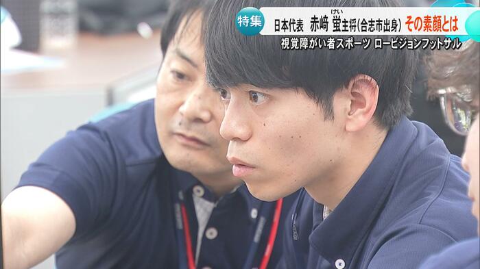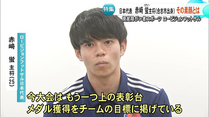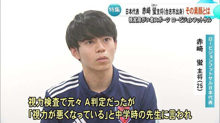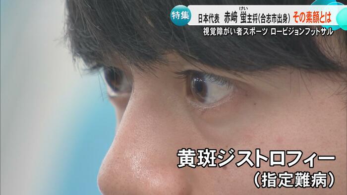 熊本・合志市出身の赤﨑蛍選手は、パリオリンピック男子マラソンで8位入賞を果たした赤﨑暁選手のいとこで、ロービジョンフットサル日本代表のキャプテンを務めている。赤﨑選手は「視力検査で元々A判定だったが、『視力が悪くなっているね』と当時の先生に言われ、病院を勧められて分かった」と話す。