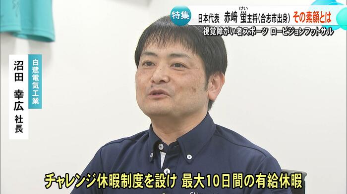 沼田幸広社長は「チャレンジ休暇制度を設け、最大10日間の有給。『自分は日本代表で頑張ってくるから有給をください』と赤﨑選手がプレゼンして満場一致で10日間の有給が決まった」と話す。