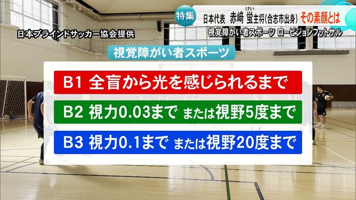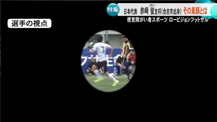 赤﨑選手は「ディフェンスをするときのロングボールに対応しなきゃいけない場面でたくさんミスをした。視界の真ん中に邪魔が入ったような見え方、視野は普通で『B3』」と話した。その後、進学した熊本盲学校で、ロービジョンフットサルの存在を知ると、わずか1年ほどで日本代表デビューを果たした赤﨑選手。現在はキャプテンを務めている。