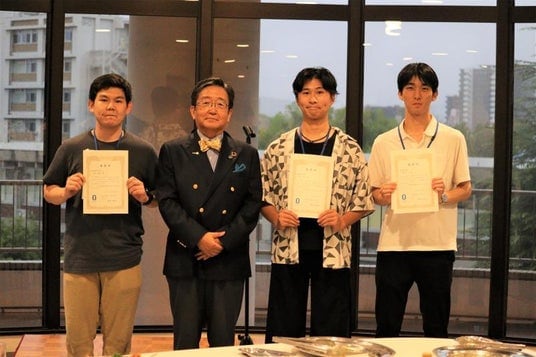 那須学長と発表受賞者(左から清水さん、那須学長、薮口さん、佐藤さん)