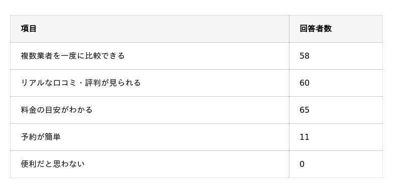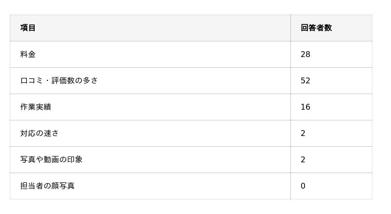 ・最も重視されている情報は「口コミ・評価数の多さ」で、「料金」よりもまずは業者の評判の良さを確認する傾向がある。