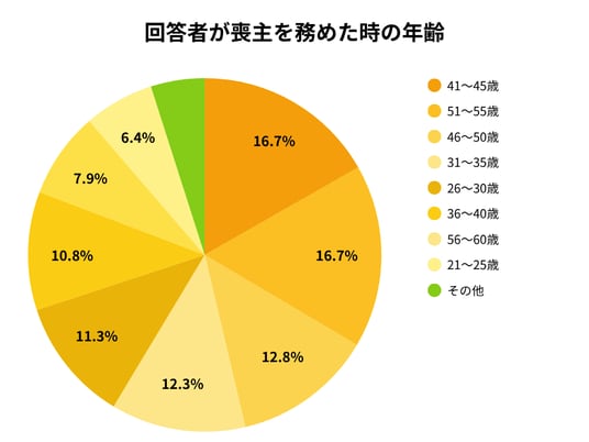 ・就業中の喪主は主にミドル層。 喪主を務めた時の年齢は41~55歳が46.3%を占める。
