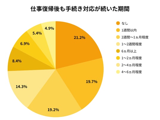 ・忌引き休暇や有給などで仕事を休んだ日数は「5日」が最多(28.1%)で、10日以上が9.4%。また仕事復帰後も継続して対応した人の割合は78.8%で、その手続きが2か月以上続いた人は18.7%。