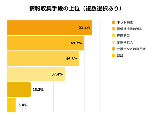 ・情報収集は分散・非効率。 手続きの情報収集に5時間以上かかった人が29.6%、手段はネット検索が最多で55.2%、葬儀社提供の資料が49.7%、役所窓口が46.8%と続く。