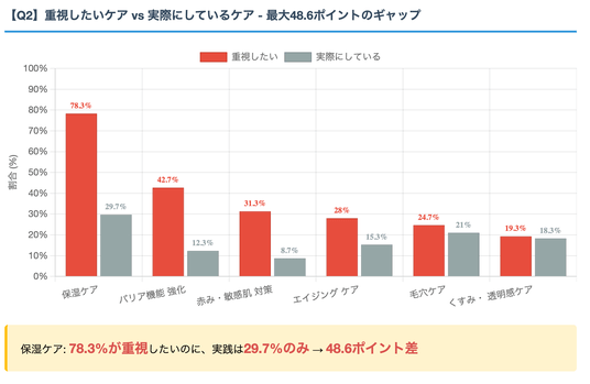 特に「保湿ケア」「バリア機能強化」「赤み・敏感肌対策」など、季節の変わり目に必要とされるケアで、意識と行動の乖離が大きいことが分かりました。