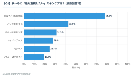 その結果、「保湿ケア(乾燥対策)」が78.3%で圧倒的1位となり、次いで「バリア機能強化」(42.7%)、「赤み・敏感肌対策」(31.3%)という結果になりました。