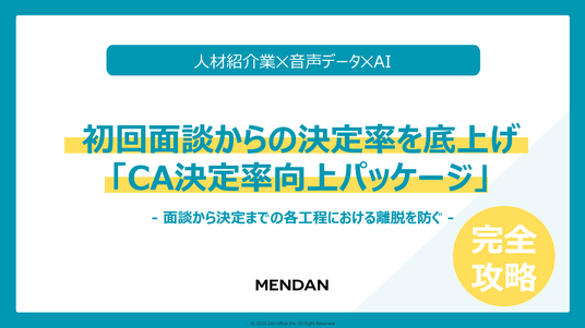 MENDANは「人材紹介決定プロセス変革支援」というサービスコンセプトのもと、音声×AIによる革新的な機能開発を継続してまいります。今回の「CA決定率向上パッケージ」は、業務改善からKPI向上までを包括的に支援する第一歩であり、今後も人材紹介業界の課題解決に向けた新機能を順次リリース予定です。キャリアアドバイザーが本来の価値提供である「お客様コミュニケーション」により多くの時間を使える環境を創出し、人材紹介業界全体の生産性向上と、日本の雇用市場の活性化に貢献して参ります。
