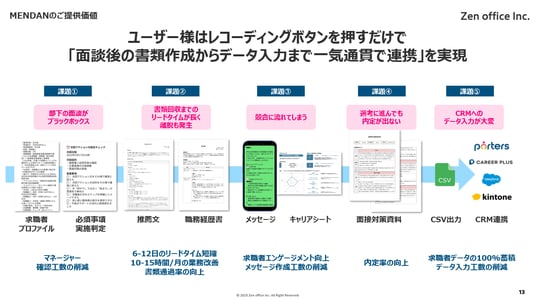 面談後の書類作成やデータ入力に時間がかかると、書類回収や次回面談への移行が遅れ、結果として決定までの歩留まりが下がります。MENDANは、面談の録音→自動可視化→各種書類の自動生成→CSV出力→CRM連携までを一連で支援し、業務時間の大幅な短縮とKPI(重要指標)の改善を同時に実現します。ご導入事例