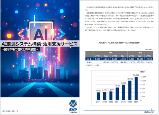 会員制マーケットリサーチサービスを提供している、株式会社SVPジャパン(本社:東京都中央区、代表取締役社長:橋本 雅、以下「SVPジャパン」)は、本日、SVP注目市場分析レポート「AI関連システム構築・活用支援サービス-国内市場の現状と将来展望-」を、会員企業向けに公開いたしました。