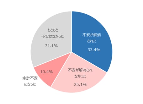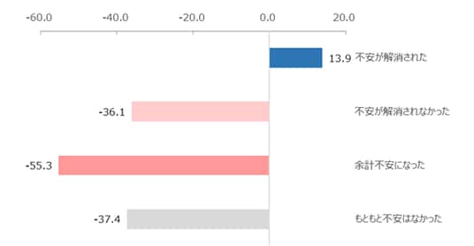 さらに、市場動向急変に関する案内や通知を受けて、不安の解消につながったかどうかを調査したところ、「不安が解消された」と回答した割合は33.4%となりました。「不安が解消されなかった」(25.1%)や「余計不安になった」(10.4%)も一定割合みられました。さらにNPSについても分析したところ、株価急落に関する案内や通知を受けて「不安が解消された」人のNPSは13.9と、他の回答者と比較して高くなりました。