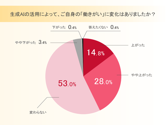 - 生成AIの活用で、4割以上の人が働きがいが「上がった」と回答。