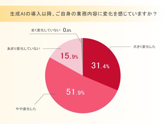 生成AIの導入以降、業務内容に変化を感じているかたずねたところ、「大きく変化した」が31.4%、「やや変化した」が51.9%と、8割以上のITエンジニアが、変化を感じていると回答しました。