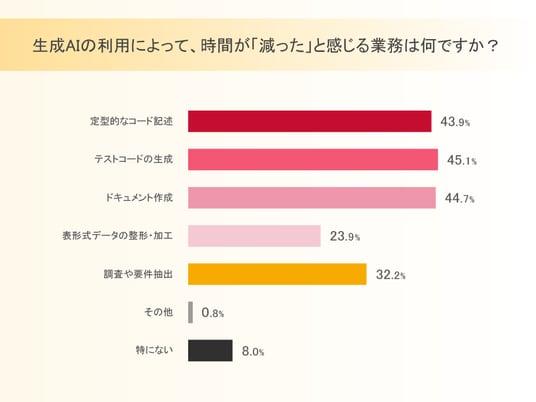 生成AIの利用によって、時間が減ったと感じる業務を選択してもらったところ、最も多かったのは「テストコードの生成」で、45.1%の人が減ったと感じると答えました。そのほか「ドキュメント作成(44.7%)」、「定型的なコード記述(43.9%)」が続きました。