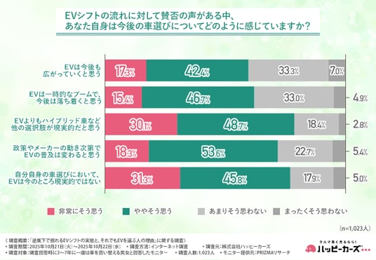 「EVシフトの流れに対して賛否の声がある中、あなた自身は今後の車選びについてどのように感じているか」を尋ねたところ、以下のような回答結果になりました。
