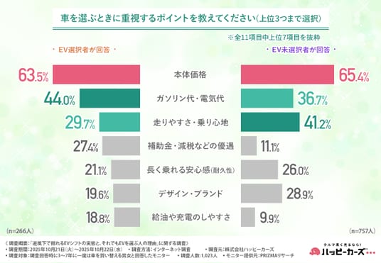 上位となった項目は共通していますが、EV選択者はEV未選択者よりも「ガソリン代・電気代」を重視しており、それが燃料代が安いEVの選択につながっていることがうかがえます。