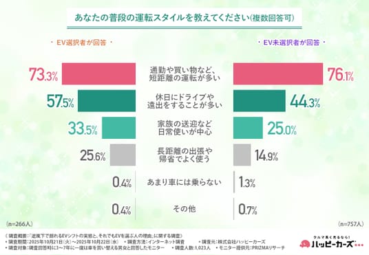 EV選択者は「休日のドライブや遠出」「長距離の出張や帰省」の割合がEV未選択者よりも高いことがわかります。