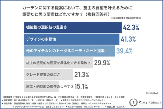 「カーテンに関する提案において、施主の要望を叶えるために重要だと思う要素」について尋ねたところ、『機能性の選択肢の豊富さ(遮光・断熱・メンテナンス性など)(42.3%)』が最も多く、『デザインの多様性(色・柄・スタイル・素材など)(41.3%)』『他のアイテム(ラグ・カーペットなど)とのトータルコーディネート提案(39.4%)』と続きました。