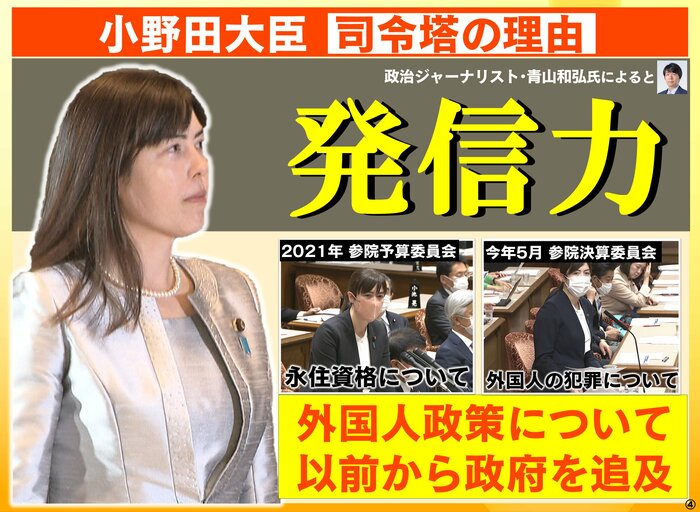 その外国人政策の“司令塔”が…父親がアメリカ人で、母親が日本人の小野田紀美外国人共生相(42)です。