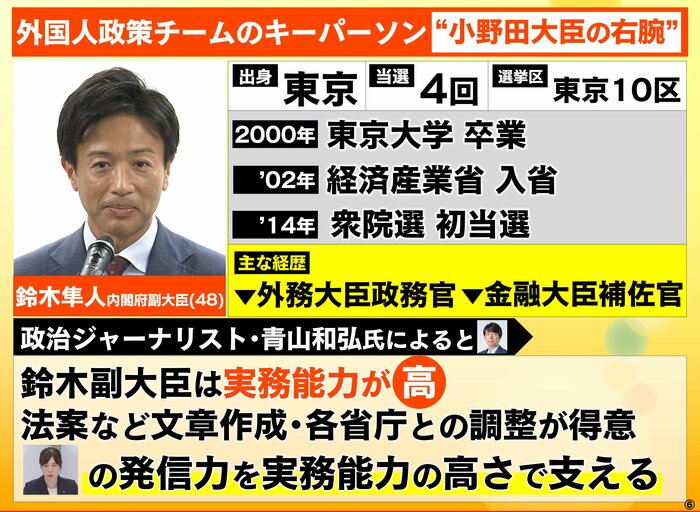 小野田大臣に続く外国人政策チームのキーパーソン、2人目が“小野田大臣の右腕”鈴木隼人内閣府副大臣(48)です。