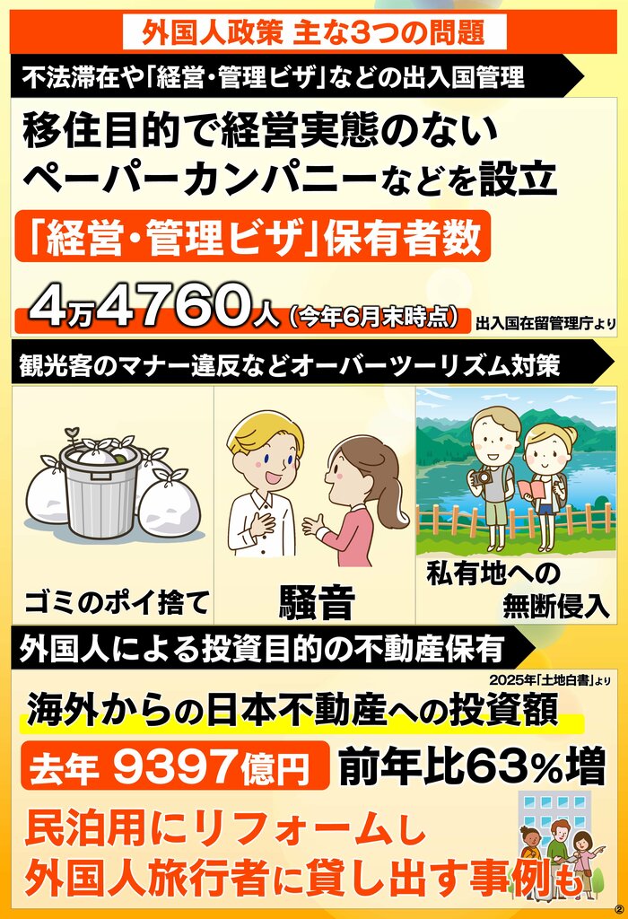 問題はこれだけでもないんですね。例えば、日本国籍を取るのがあまりにも簡単すぎるんじゃないかとか、出入国・在留管理のあり方とか不法滞在の問題、とにかく多岐にわたっている。自民党以外の政党もそうですけれども、こうした外国人の問題、日本は移民政策をとっていないからということで、非常に緩く、あまりちゃんと向き合ってこなかった。高市政権としては柱としてやるということですが、今までちゃんと向き合ってこなかったツケが一気に出ていると言っていいと思います。