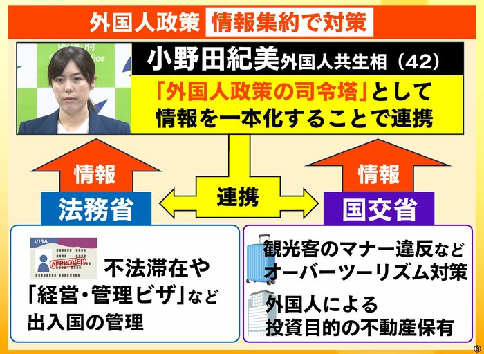そこで、小野田大臣が「外国人政策の司令塔」として情報を一本化することで各省庁を連携。