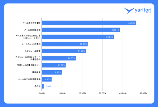 - メール業務へのAI活用の最多は「下書き作成」、時間短縮と質向上の効果も明らかに