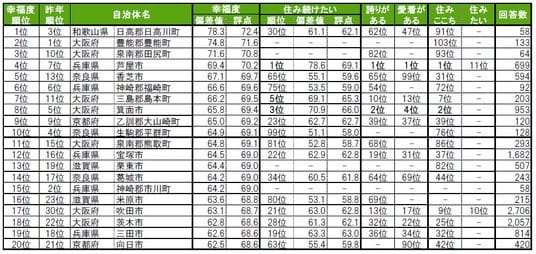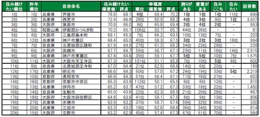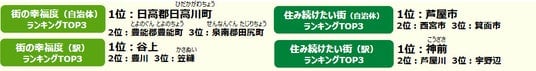 街の幸福度ランキングは、 「全体としてみて、あなたは現在、幸せですか、あるいは不幸せですか」に対して、 1点(非常に不幸)から10点(非常に幸福)までの10段階で評価してもらい、その回答の平均値を10倍して、100点満点に換算。住み続けたい街ランキングは、「今住んでいる街に、ずっと住んでいたいと思う」に対して、 「そう思う」:100点から「そう思わない」:0点までの5段階評価をしてもらい、その回答の平均値で作成。「誇りがある」「愛着がある」も「住み続けたい街ランキング」と同様の方法で作成。