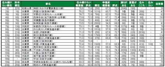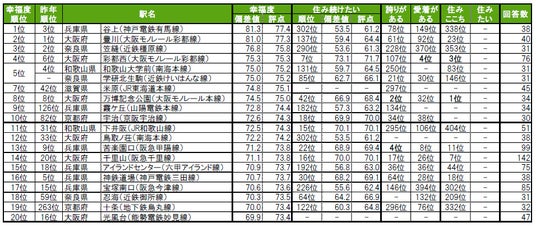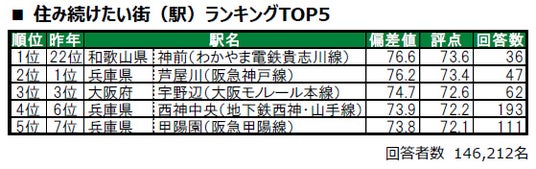 和歌山市に位置する神前が、昨年22位から大きく順位を上げて上げて、ランキング開始から初の1位に輝きました。2位は芦屋市に位置する芦屋川、3位は2年連続で茨木市に位置する宇野辺です。その他昨年より特に順位を上げてトップ10入りしたのは、9位余部(昨年21位)、10位夙川(昨年23位)で、いずれも兵庫県に位置する駅です。