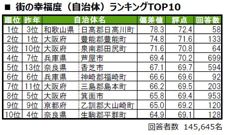 ■街の幸福度(自治体)トップは、初の1位となった和歌山県日高郡日高川町(ひだかがわちょう)