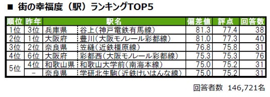 1位は神戸市北区に位置する谷上で、昨年3位から順位を上げました。2位は茨木市に位置する豊川で、トップ2は偏差値80台の極めて高い評価を得ています。3位は、磯城郡田原本町に位置する笠縫です。その他トップ10内で初登場の駅は、5位タイでランクインした奈良県学研北生駒で、昨年は累計回答者数が30名未満でランキングの集計対象外でした。