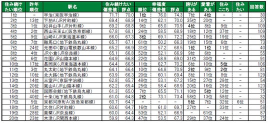※昨年順位を「ー」と表示しているのは、自治体で回答者数が50名未満、駅で30名未満など集計の規定に満たない場合、または偏差値が50未満で順位を公表していない場合です。