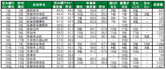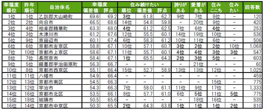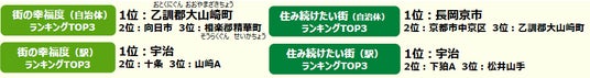街の幸福度ランキングは、 「全体としてみて、あなたは現在、幸せですか、あるいは不幸せですか」に対して、 1点(非常に不幸)から10点(非常に幸福)までの10段階で評価してもらい、その回答の平均値を10倍して、100点満点に換算。住み続けたい街ランキングは、「今住んでいる街に、ずっと住んでいたいと思う」に対して、 「そう思う」:100点から「そう思わない」:0点までの5段階評価をしてもらい、その回答の平均値で作成。「誇りがある」「愛着がある」も「住み続けたい街ランキング」と同様の方法で作成。