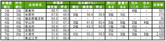 1位は、初登場の犬上郡多賀町です。2位は長浜市、3位は守山市です。今回初登場でトップ9入りしたのは、1位の多賀町、8位の豊郷町(とよさとちょう)で、いずれも犬上郡に属する町です。いずれも昨年は累計回答者数が50名未満で、ランキングの集計対象外でした。