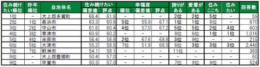 ※住み続けたい街・街に誇りがある・街に愛着があるの順位が「-」と表示されているのは、偏差値50未満のため「-」と表示しています。