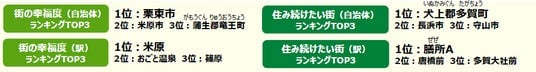 街の幸福度ランキングは、 「全体としてみて、あなたは現在、幸せですか、あるいは不幸せですか」に対して、 1点(非常に不幸)から10点(非常に幸福)までの10段階で評価してもらい、その回答の平均値を10倍して、100点満点に換算。住み続けたい街ランキングは、「今住んでいる街に、ずっと住んでいたいと思う」に対して、 「そう思う」:100点から「そう思わない」:0点までの5段階評価をしてもらい、その回答の平均値で作成。「誇りがある」「愛着がある」も「住み続けたい街ランキング」と同様の方法で作成。