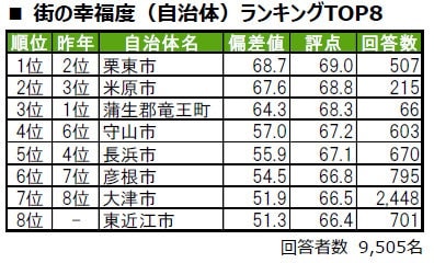1位は栗東市で、昨年2位から順位を上げてトップに輝きました。2位は昨年3位から順位を上げた米原市、3位は蒲生郡竜王町(がもうぐん りゅうおうちょう)です。トップ8内では、昨年は偏差値50未満で順位を公開していなかった東近江市が8位にランクインしています。
