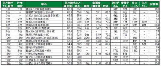 ※昨年順位を「ー」と表示しているのは、自治体で回答者数が50名未満、駅で30名未満など集計の規定に満たない場合、または偏差値が50未満で順位を公表していない場合です。