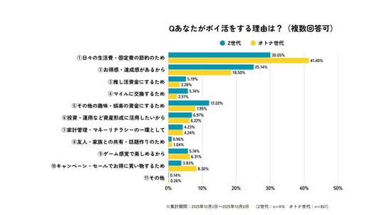 ポイ活の動機は、「日々の生活費・固定費の節約のため」「お得感・達成感があるから」がトップ2位を占めるという点で両世代に共通していますが、その捉え方には違いがうかがえます。Z世代はポイ活を「推し活・趣味活」を支える資金を、達成感と共に得るための楽しい手段と捉えている一方、オトナ世代は家計を防衛するための計画的・実務的な手段として活用しているようです。