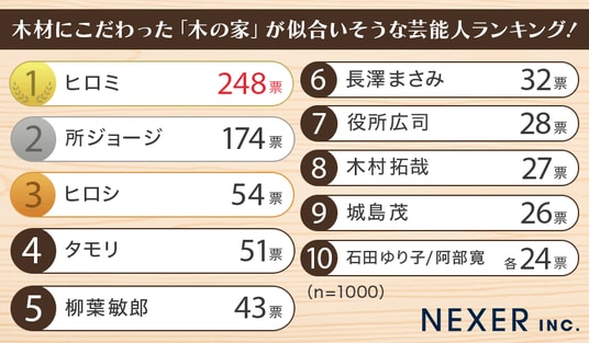 ということで今回は株式会社和秋建設と共同で、全国の男女1000名を対象に、木材にこだわった「木の家」が似合いそうな芸能人」についてのアンケートを行いました。