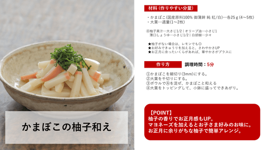 一正蒲鉾はこういった時代とともに変わりつつあるニーズに応えて、家族みんなでおせちを楽しめるレシピやねりデコ、国産原料100%の「純」シリーズを提案します。