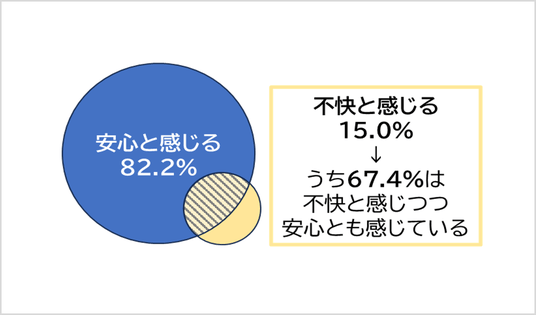 不快だと感じる15.0%の人の中で67.4%は安心とも感じている
