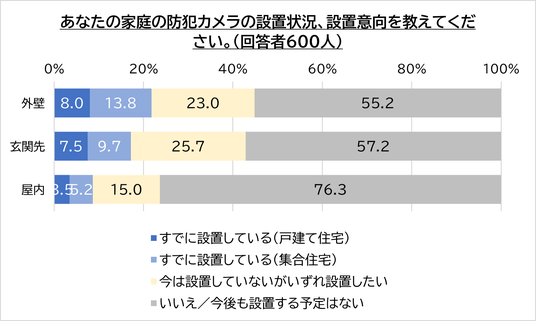 防犯カメラを外壁に設置していると回答した人は、集合住宅で最初から設置した人を含めると26.8%でした。現在は設置していないものの、4人に1人は玄関先(25.7%)や外壁(23.0%)にいずれ防犯カメラを設置したいと考えていることが分かりました。