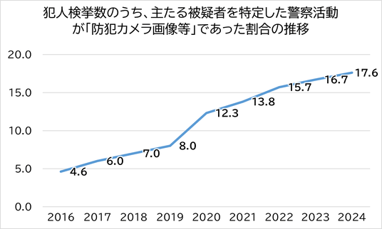 令和7年防犯白書によれば、警察の検挙件数のうち、主たる被疑者を特定した警察活動が「防犯カメラ画像等」であった割合は増加しており、防犯カメラの存在が、被疑者の特定に貢献していることが分かります。(令和7年警察白書より)